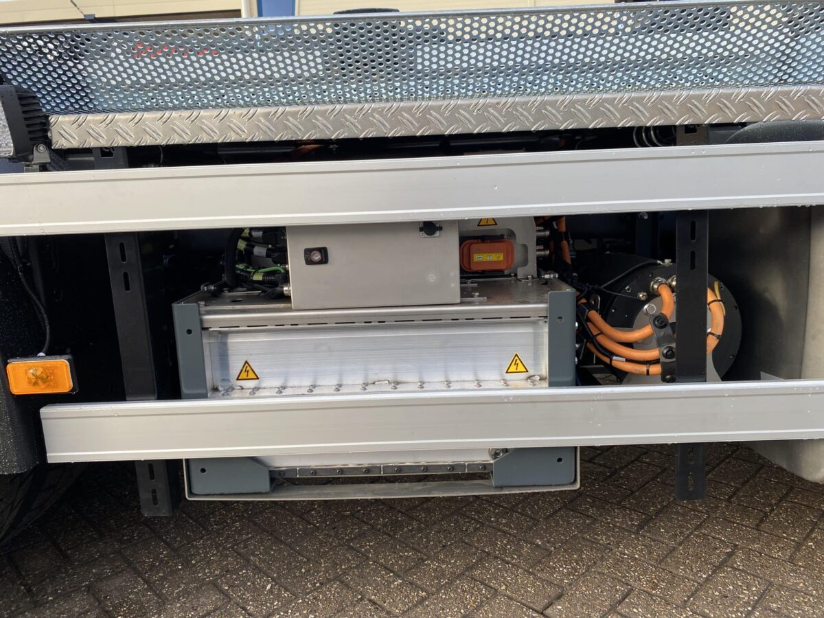 De E-PTO is uitgerust met een accupakket van 40 kWh en volledig opgebouwd op een compact frame aan de rechterzijde van het chassis. Dankzij deze prefab oplossing kan de installatie efficiënt worden uitgevoerd en wordt de doorlooptijd in onze werkplaats aanzienlijk verkort.